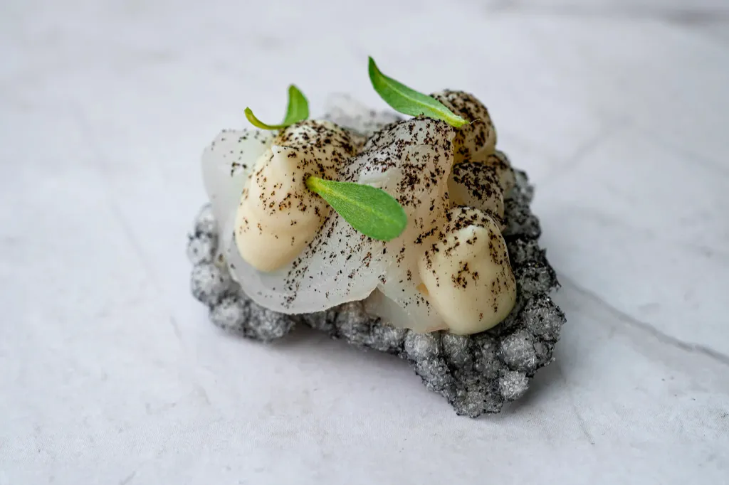 Sepia Tapioka – Små perler av sepia-innfarget tapioka som gir en delikat tekstur og subtil smak av havet.