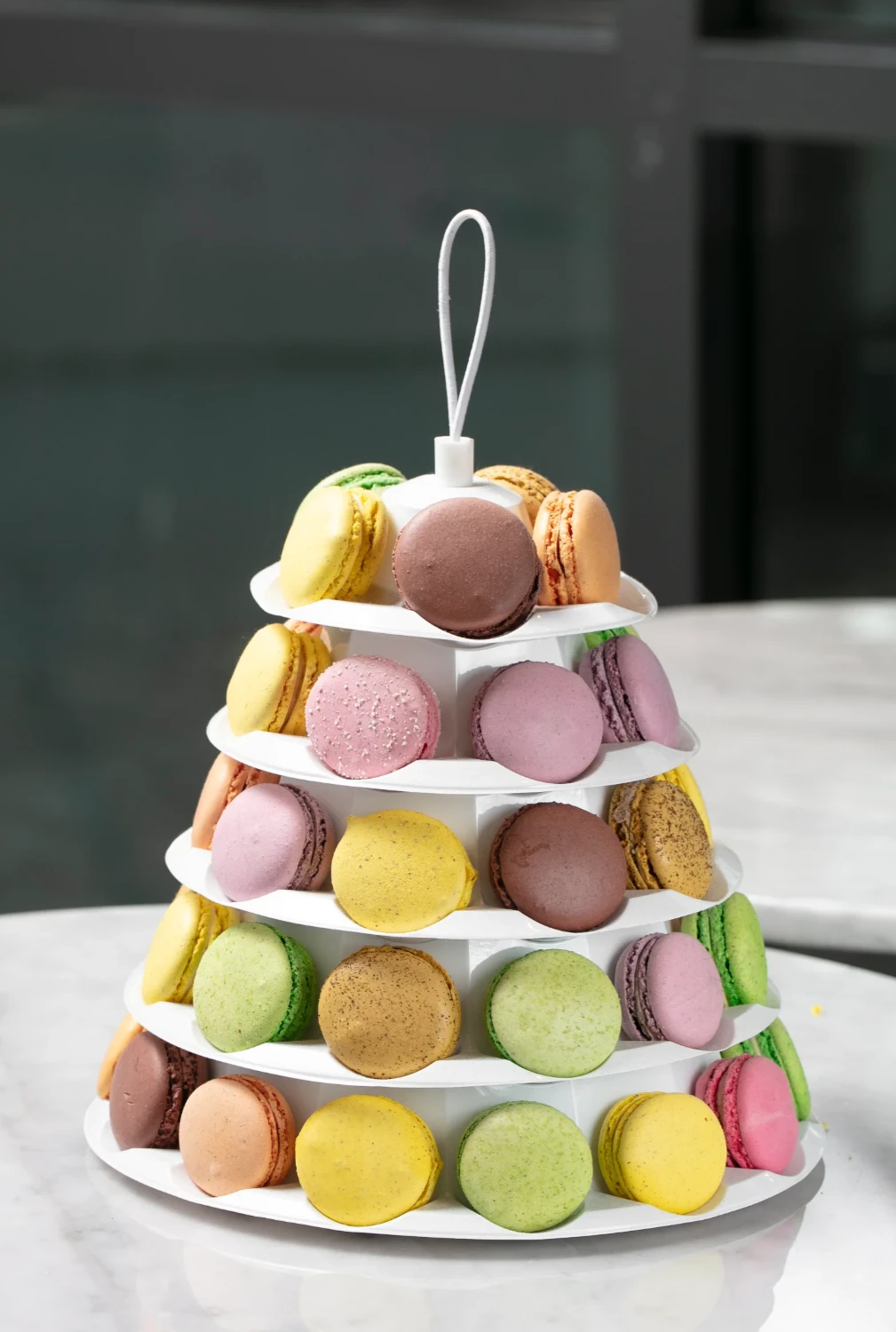 Pyramide fylt med makroner, idealt til bryllup og konfirmasjon.