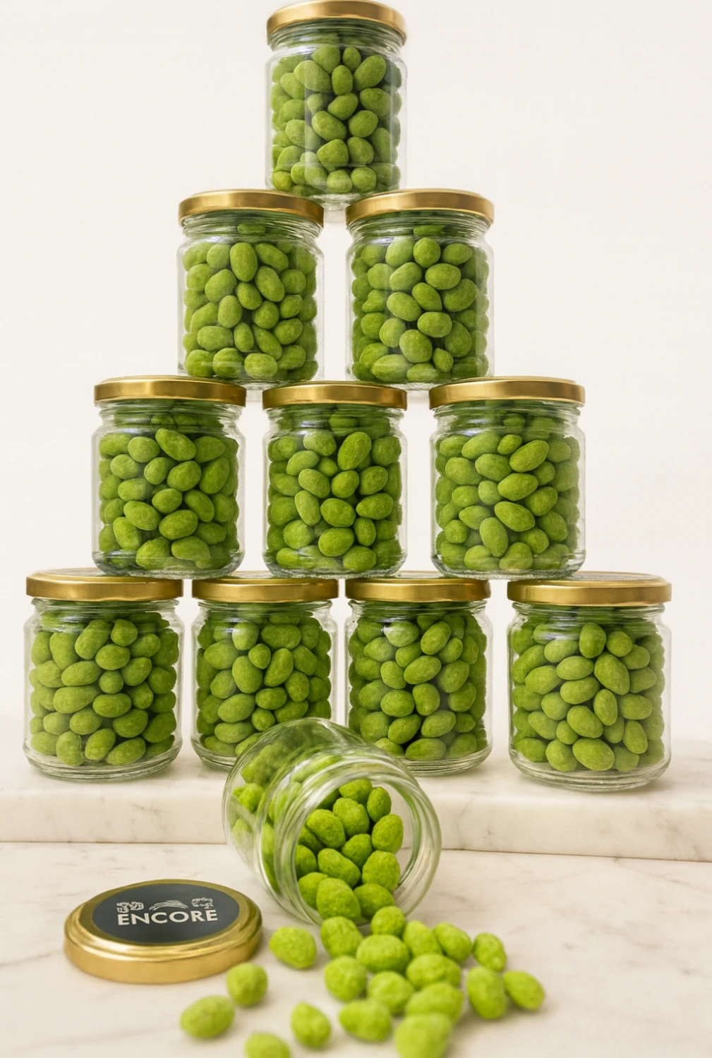 20 biter. Den perfekte balansen: lett ristede pistasjnøtter trukket med et tynt lag hvit sjokolade, toppet med en klype salt.